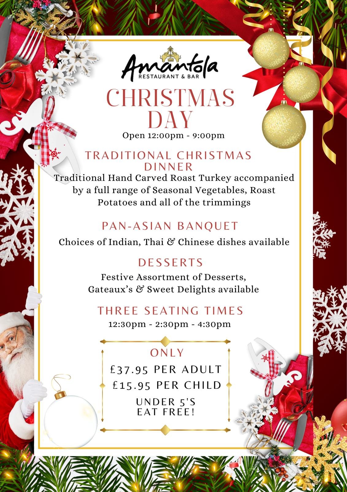 Savour authentic Asian dishes crafted with fresh ingredients, traditional spices, and time-honoured recipes. From sizzling stir-fries to delicate dim sums, every bite is a journey through the heart of Asia. Perfect for food lovers seeking genuine flavours to ‘Celebrate Christmas Day in style at The Amantola.’ Enjoy a traditional Christmas dinner with all the trimmings and a glass of festive cheer, alongside our Pan-Asian buffet featuring authentic dishes crafted with fresh ingredients and bold, seasonal flavours. Finish with a selection of irresistible desserts — the perfect way to round off a joyful meal shared with family and friends.
